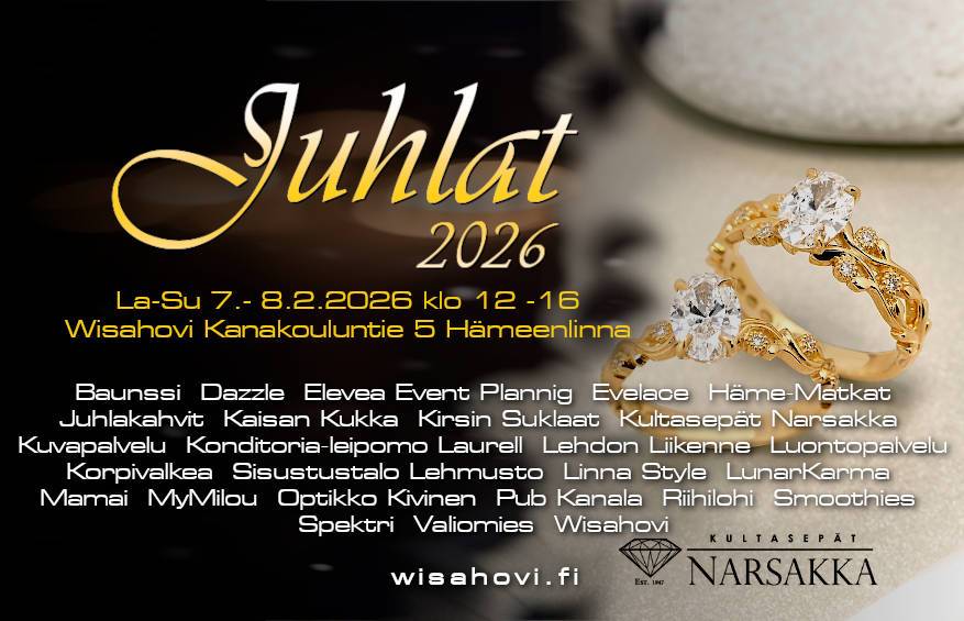 Vuoden juhlat odottavat ja nyt voit vilkaista kauden 2026 trendeihin, pukuihin, koruihin, elämyksiin ja kattauksiin & somisteisiin ja herkkuihin. Näytteilleasettajia on liki 30 ja myös Wisahovissa kaikki ovet auki tutustua upeisiin tiloihin.